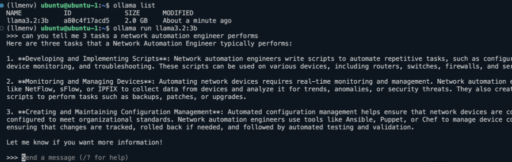I can then ask it a question, if you get a response your local LLM is working!